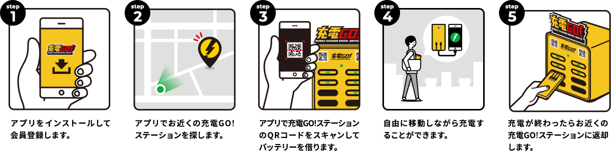 「充電GO!」は、“いつでも充電、どこでも充電”をコンセプトにしたモバイルバッテリーのレンタルサービスです。「充電GO!」専用のアプリで会員登録した後は、「充電GO!」ステーションでQRコードを読み取るだけで、簡単にバッテリーをレンタルすることができます。返却場所は別のステーションでも可能なため、自由に移動しながら充電をして、用事などを済ませた後は移動先で最寄りの「充電GO!」ステーションへ返すことができます。