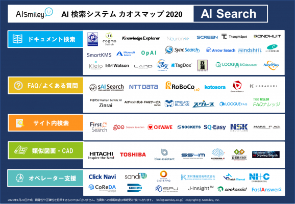2020年1月現在、日本国内における主要なAI検索システムを導入の目的別に俯瞰できる唯一のカオスマップとなります。