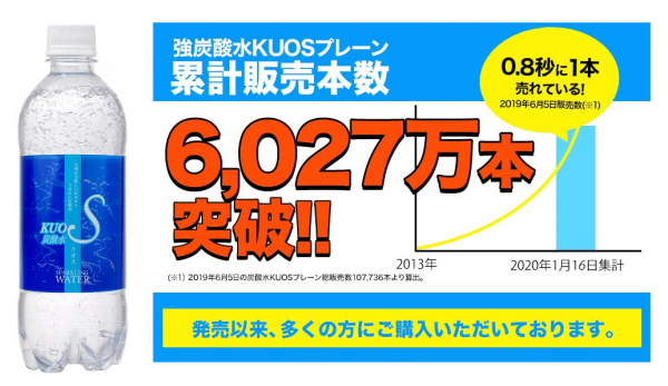 株式会社OTOGINO(オトギノ:代表取締役社長 鬼武公洋 本社 大分県日田市北友田 2 丁目 2123 番地 1)がE-コマースにて販売している主力商品、うまさを感じる強炭酸水『KUOS-クオス-』の累計販売本数が6,027万本を突破しました。(2020年1月16日集計)また、大型ECショッピングモール「楽天市場」の水・ミネラルウォーター(発泡)部門ランキングでは251週1位を獲得しております。(2020年1月22日現在)