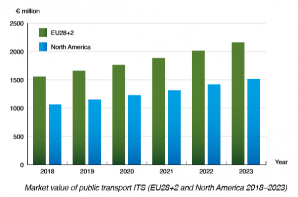 2020年以降の欧州と北米の公共交通における高度道路交通システム(ITS)市場はどのように発展していくのだろうか。スウェーデンの調査会社ベルグインサイト社(Berg Insight)の調査レポート「欧州と北米の公共交通機関における高度道路交通システム (第7版)」は、欧州と北米のバスやトラムなどの公共交通ITSの市場総額は2018年の26億3000万ユーロから年平均成長率(CAGR)6.9%で成長し、2023年には36億8000万ユーロに達するだろうと予測している。欧州と北米の公共交通における高度道路交通システム市場の最新の発展動向を洞察し、5年間の市場予測、事業上の意思決定に役立つ専門家のコメント、べンダ、製品、市場についての最新情報も記載している。
