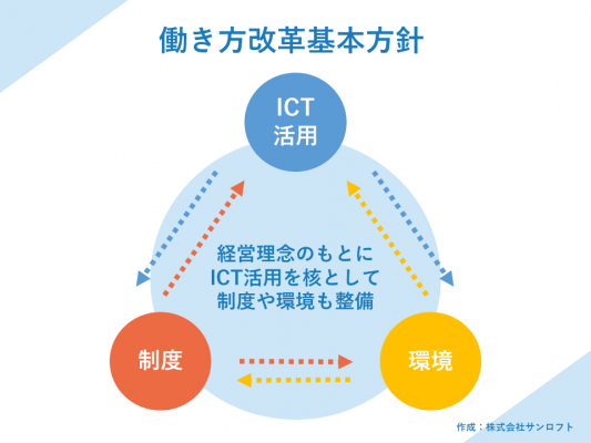 この働き方改革の実践事例は、全社員ミーティングのワークショップで収集した意見に基づいており、「ICT活用」「制度・ルール」「オフィス環境」の3つの側面から、社名にちなみ36項目にまとめました。