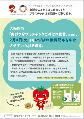 大阪いずみ市民生協は、大阪府の「おおさかプラスティックゴミゼロ宣言」に賛同し、2020年2月4日(火)より、全店舗でレジ袋の無料配布を中止し、組合員のみなさまと一緒にプラスティックゴミの削減にとりくみます。