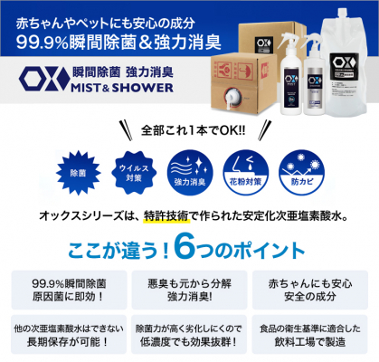 OXシリーズとは、これまでの除菌・消臭スプレーの問題を全て解決した、安全且つ最新の製品です。