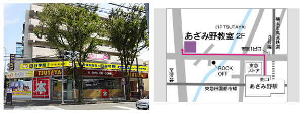 あざみ野駅前教室。たまプラーザ駅前教室から移転オープンした個別指導教室です。あざみ野駅東口から徒歩3分と大変近く、小学生の方も安心して通っていただけます。