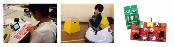 イベント開催に合わせて開発されたプログラミング専用の小さいパソコン「GACHAPIN Dake」と「MUKKU Igai」を使ってプログラミングを体験します。キーボードで文字を打ち込んでプログラミング。LEDを光らせる簡単なプログラムから、ロボットを動かすプログラムまで楽しくプログラミングを学びます。