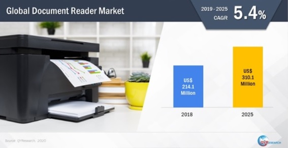QYResearchによると、世界のドキュメントリーダーの収益は、2018年に2億米ドルに達し、2025年末までに3億米ドルへ到達すると予測されています。2019-2025年にかけて、5.4%のCAGR (年間複合成長率) で市場は成長する見込みです。