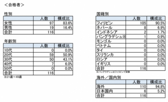 また、合格者数では女性84%、男性16%、年齢別では20代51%、30代43%、国別ではフィリピン90%、ネパール7%、そして、日本国内受験者は全体の5%となります。