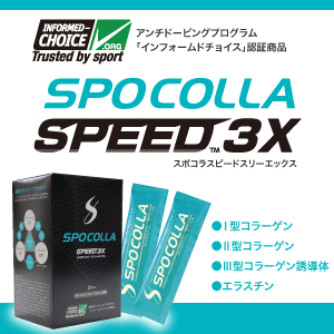 ●スポコラ・スピード3X:「ケガに負けない身体」をコンセプトに、筋肉(筋膜)損傷、靭帯損傷、関節損傷などの予防・改善をサポートするサプリメント。食べやすいグレープフルーツ風味のゼリーで、筋膜成分、靭帯成分、腱成分、軟骨成分を多く含む線維状プロテインを1包あたり3000mg配合。アンチ・ドーピング認証商品(インフォームド・チョイス)https://spocolla.jp