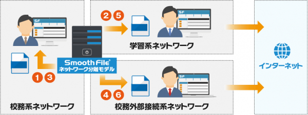3つのネットワーク間で発生する6通りのファイルのやり取りを Smooth File ネットワーク分離モデル1台で実現します