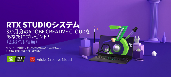本キャンペーンは、NVIDIAとAdobeの協賛によるクリエイター向けキャンペーンで、Photoshop、Lightroom、Illustrator、PremierなどのAdobe製クリエイティブアプリケーションやさまざまなフォントなどを3カ月間フルに利用できるAdobe Creative Cloudのサブスクリプションを提供するものです。期間中に対象製品をご購入された方は、