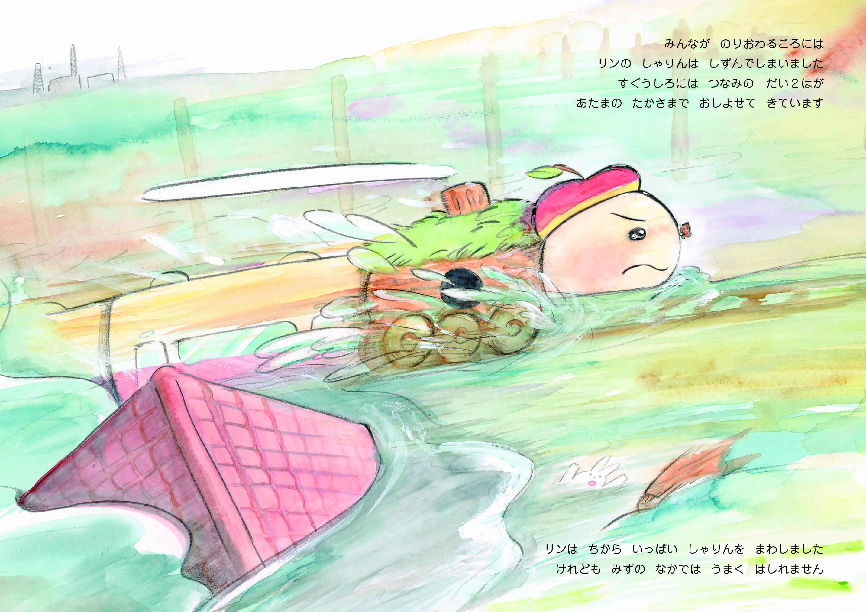 復興を目指す町に堤防と電柱が張り巡らされても、もりのきでんしゃ「りん」の目からは涙がこぼれ続けます。