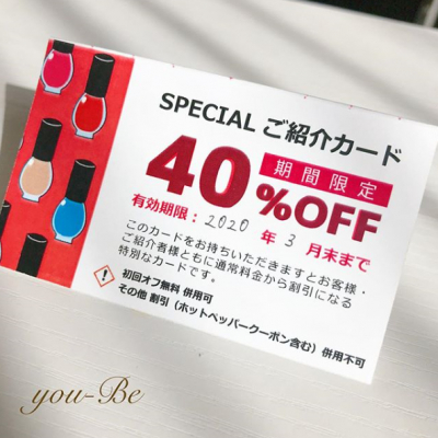 株式会社ナウい(本社所在地:東京都豊島区、代表取締役:桑山 裕史)は、当社が提供するプライベートネイルサロンyou-Be(ユービー)にて、2020年2月14日から、ご利用料金が40%OFFとなる「スペシャルご紹介キャンペーン」を開始いたしました。