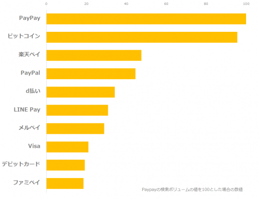 調査の結果、PayPay(ペイペイ)が1位となりました。PayPayは2018年10月から提供が開始され、もっとも多くの人に利用されているスマホ決済サービスとして広く認知されています。(*2)次いで僅差で検索2位となったのがビットコインです。ビットコインは仮想通貨の中でも世界的に一番取引額の多い仮想通貨です。2017年には国内の日本円-ビットコイン取引市場で最高価格を記録し、国内での関心も一気に高まりました。また、TOP10にスマホ決済サービスが6種類もランキングに入っており、スマホ決済への関心の高さも伺えます。スマホ決済市場は、2018年度に約1.1兆円だった市場規模が2020年度には2.9兆円規模に急拡大するという予測も発表されているほど、利用者数が今後増加するものと思われます。(*3)