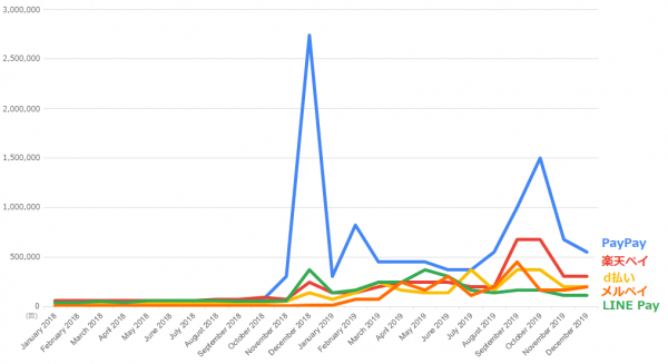 2018年12月にPayPayがポイント還元の大規模なキャンペーンを実施したことで一気に消費者の関心度が上がったものと考えられます。その時期をきっかけに、他のスマホ決済サービスの検索ボリュームも伸びており、キャンペーンをきっかけにスマホ決済への興味関心が高まったと考えられます。