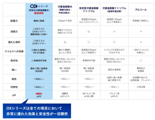 また、様々な生成方法がある次亜塩素酸水はHClOが主成分ですので優れた除菌効果はありますが、その成分が安定しないため直ぐに効果がなくなることが弱点です。OXシリーズの安定化次亜塩素酸水は、次亜塩素酸ナトリウムのナトリウム部分だけを独自の技術(特許取得)で取り除くことに成功した、非常に安定的な成分です。