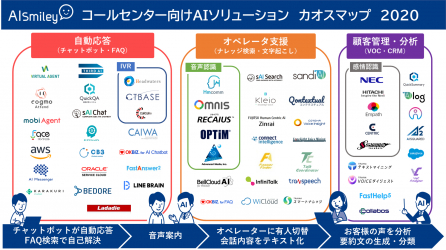 人工知能を搭載したサービスの資料請求ができるAIポータルメディア「AIsmiley」を運営するアイスマイリー(東京都渋谷区、代表取締役:板羽晃司)は、「コールセンター向けAIソリューション カオスマップ2020」を2020年2月18日に提供開始しました。掲載数は合計で58サービス。