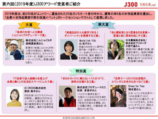 国内最大級の女性経営者データベースサイトを運営する女性社長.net((株)コラボラボ企画・運営 本社:東京都千代田区 代表取締役:横田響子)は、2020年2月19日に全国の個性あふれる女性起業家を表彰する「J300アワード」大賞・準大賞・特別賞の受賞者を発表しました。