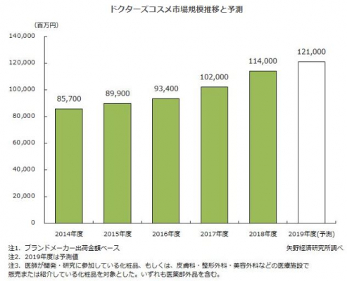 2019年度のドクターズコスメ市場規模(ブランドメーカー出荷金額ベース)を、前年度比106.1%の1,210億円と予測する。