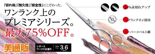 プロ向け美容材料の通信販売サイト「美通販」が、シザースワークス企画5 「ワンランク上のプレミアシリーズ」シザースキャンペーンを開催中です。毎回ご好評をいただいているシザースワークスキャンペーン企画の第5弾として、「切れ味」「耐久性」「安全性」にこだわった「ワンランク上のプレミアシリーズ」シザースを、最大75%OFFの業界最安値を目指した美通販会員様特別価格にてご提供いたします。本キャンペーンは2020年3月6日(金)まで開催いたしますので、この機会に、たくさんの方々にご利用いただきたいと考えております。
