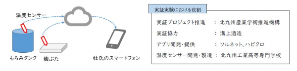 北九州地区ものづくり中小企業におけるIoT技術導入を促進するため、「工場内の見える化・稼働中の製品の見える化」のモデルケースとして実施される実証実験に、ソルネットは以下のような役割で2018年より参画しており、本年2月からの実証実験(酒造メーカーにおける、麹やもろみの発酵温度計測の効率化)についても支援していきます。