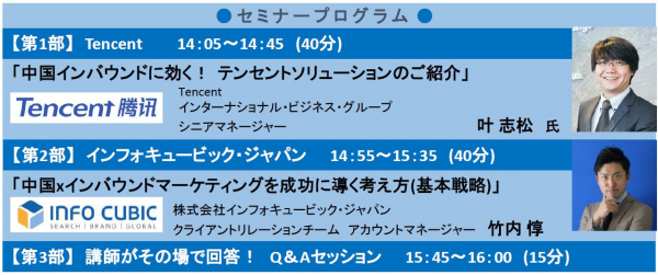 世界各地の中華系の方々はもちろん、中国から日本に旅行中の観光客の方々の多くが利用している中国発SNS『WeChat』。2020年は中国から多数の訪日観光客が見込まれており、今回のセミナーにはWeChatを活用したマーケティング施策に本格的に取り組みたいとお考えの企業様のマーケティングご担当者様が多数ご参加されました。【第1部】のテンセント社講義では、「中国人をめぐるデジタル最新事情」「WeChat概要」などをお伝えするとともに、東京五輪前の「旅マエ」期間におすすめしたい施策をご紹介。【第2部】のインフォキュービックの講義では、 「WeChatプロモーションの具体的な進め方」や「SNS・広告・ウェブサイトを含めた中国 x インバウンドマーケティングのポイント」を共有させていただきました。【第3部】に設けたQ&Aセッションではたくさんの質問をお寄せいただき、講師がその場で回答する時間も設けられました。セミナー後には、ご参加された皆様から「リアルなWeChat情報を聞けて良かった」「訪日中国人のトレンドについての情報が参考になった」「訪日予定外国人に自社サービスを知ってもらうための施策の道筋が見えた」といった前向きなご感想を多数いただき、東京オリンピック・パラリンピックという「最高潮に高まるインバウンドビジネスチャンス」に向けて有効な情報を掴んで頂けたことを運営スタッフ一同強く実感いたしました。