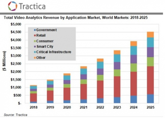 計算能力の向上とカメラの解像度の向上により、コンピュータービジョンのアルゴリズムが成熟し、すべての面において精度の向上に役立っています。ビデオ分析ソリューションは、セキュリティアプリケーションの分野で重用されており、監視システムオペレータ、セキュリティ担当者、および企業経営者のニーズを満たす理想的なソリューションとなっています。しかし、多くの業界では、セキュリティ分野の枠をはるかに超えたさまざまなアプリケーションにVAシステムを採用しています。Tracticaのプリンシパルアナリスト、アナンド・ジョシ氏によると、「VAによってデータが生成されるビジネスインテリジェンスは、ビジネス目的で使用されており、小売市場が推進するもう1つの強力なユースケースとして浮上しています。インテリジェンスは、マーケティング、運用分析、およびその他のビジネス目的に使用されてきました」。Tracticaは、世界のVA収益が2018年の11億ドルから2025年には45億ドルに増加すると予測しています。