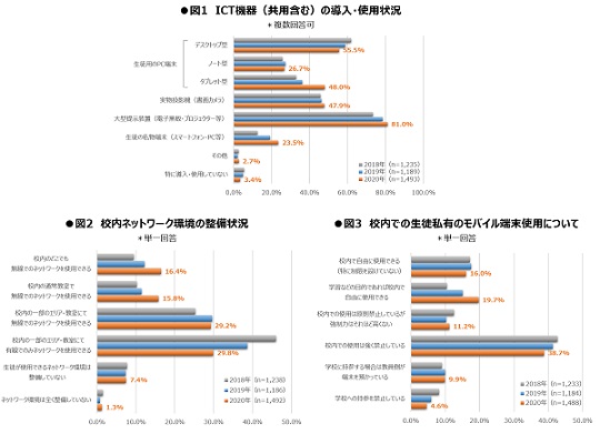 本調査では、全国の高等学校において、タブレット型PCをはじめとした生徒用端末や無線ネットワークといった、ハードウェア・設備面でのICT環境整備が、急激に進んでいることがわかりました。設備投資に十分なコストをかけられない学校においても、生徒の私物端末を学習に利用するといった工夫が見られます。