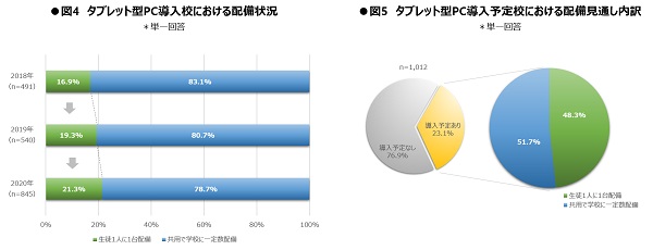 さらに、今後タブレット型PCの導入予定があるとする高等学校においては、合計48.3%が「生徒1人1台配備」を見込んでいると答えており、この傾向が私立校を中心に今後も拡大していく見通しです。〈図5〉