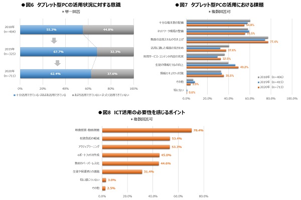 また、ICT機器を活用するためのソフトウェアやサービスは、映像・動画の視聴や「探究学習」などのアクティブ・ラーニングといった、授業変革のシーンにおいて大いに必要とされていることがわかりました。同時に、教員側のスキルアップや校務負担の軽減といった、指導者側の姿勢やあり方にも、大きな影響をもたらしています。
