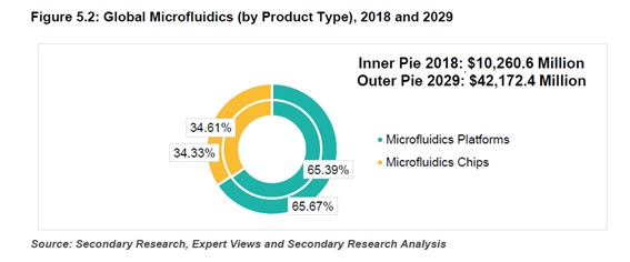 上の図はマイクロフルイディクスのプラットフォームとチップの市場価値を示しています。マイクロフルイディクス市場の七割近くを占めるのはプラットフォームです。プラットフォーム市場規模は2018年に67億950万ドルと評価され、2029年までに276億9460万ドルに達すると予想されています。この間のCAGRは13.77%です。マイクロフルイディクスプラットフォーム市場の参入企業としてはMicronit Micro Technologies、microfluidics ChipShop、uFluidixなどが挙げられます。