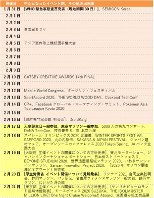 表1. イベントの中止発表日によるカレンダー ※当社調べ
