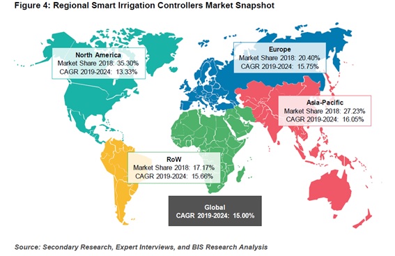 スマート灌漑制御装置の世界市場は2019年から2024年にかけて15%のCAGRで成長し2018年の2億760万ドルから2024年までに4億8,019万ドルに達すると予測されます。節水に対する需要の拡大、スマート灌漑導入の機運の高まりは参入企業にとって重要な成長機会を提供します。