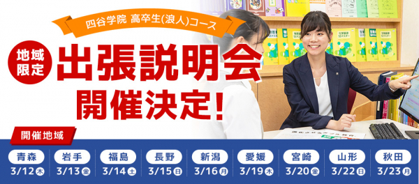 しかし、「近くに四谷学院の校舎がないけれど、説明を聞いてみたい」「55段階って何?」「寮生活をしながら志望校に合格できる?」という問い合わせが多く寄せられおり、このたび四谷学院のない地域での出張説明会を実施することになりました。