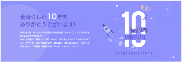 世界中の講師と生徒をつなぐオンライン習い事サイト「カフェトーク(http://cafetalk.com/)」を運営する株式会社スモールブリッジ(本社:東京都渋谷区、代表取締役:橋爪小太郎)は、2020年2月に10周年を迎え、その記念としてカフェトークの10年間のレビューを掲載した特別ページをリリースいたしました。