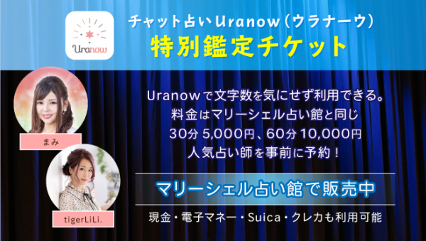 チャット占いアプリUranow(ウラナーウ)の占いをマリーシェル占い館と同様に、時間制で利用できるチケットです。ホワイトデー向け占いチケットでは、Uranow(ウラナーウ)での利用以外に、マリーシェル占い館での利用も可能です。通常、Uranowは文字数課金ですが、こちらを利用することで、30分5,000円、45分7,500円、60分10,000円という価格でウラナーウサービスをご利用いただけます。こちらは事前にウラナーウ占い師との予約ができる特別な特典が付いております。