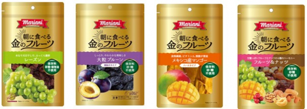 ANAフーズでは、米国マリアニパッキング社から輸入したドライフルーツなどを「朝に食べる 金のフルーツ」シリーズとして好評販売中です。