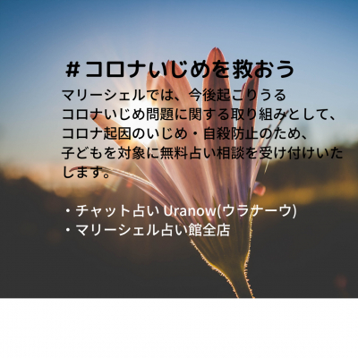 内閣府の統計から、長期休暇明けの子どもの自殺件数が多く報告され、9月1日、4月11日の順に件数が高い状況です。現在、新型コロナウイルスの感染拡大対策として政府主導で小中学校の休校が次々と報告され、3月中旬から後半、場合によっては春休みまで続く長期休暇となります。長期休暇中、子どもたちのLINE等ネットサービス利用時間は増えることになりますが、それとともに懸念されるのが、ネットいじめの問題です。今回、新型コロナウイルスの拡大で感染者を攻撃するような発言がSNS上でも増加傾向にあることから、子どもたちが利用するLINE等のメッセージサービスにおいて、コロナ起因のいじめが発生することが容易に予想されます。この子どもたちに向けられる”コロナいじめ”に関しては、これまでの個人への中傷に留まらず、子どもたちの両親や家族などを含めて中傷する言葉の暴力につながりやすく、そういったメッセージを目にする子どもたちの精神的ストレスはこれまでの個人攻撃の比ではありません。そこで弊社マリーシェルは、子どもたちのコロナ起因のいじめ対策、自殺防止策として、心のケアにつながる占い相談サービスを提供することにいたしました。東京の秋葉原、吉祥寺にそれぞれあるマリーシェル占い館、全国で利用できるチャット占いUranow(ウラナーウ)において、子どもたちのいじめや自殺相談を無料で利用できるようにいたします。