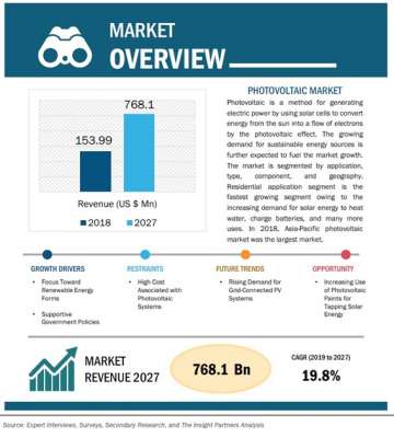 The Insight Partnersによると、世界の太陽光発電市場は、2018年に1,539億9,000万米ドル規模に達し、2027年には7,681億米ドルに到達すると予想されています。予測期間中、同市場はCAGR19.8%で成長する見込みです。当レポートでは、市場の成長促進要因および市場の著名なプレーヤーに関する情報を提供しております。