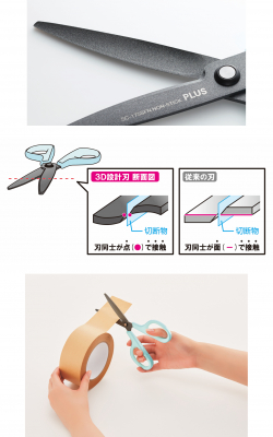 本製品は、刃の曲面加工により刃同士の接触面積を極限まで少なくしたプラス独自の“3D設計刃”に、ベタつきや汚れに強い“フッ素コート”を施すことで、100倍※3以上ベタつかない究極の“非粘着”性能を発揮します。近年、通販やフリマアプリの普及によりご家庭内でも段ボールの開梱・梱包作業が増えるなか、ガムテープなどの粘着物を切り続けても刃がベタつかず、心地よい切れ味が続きます。
