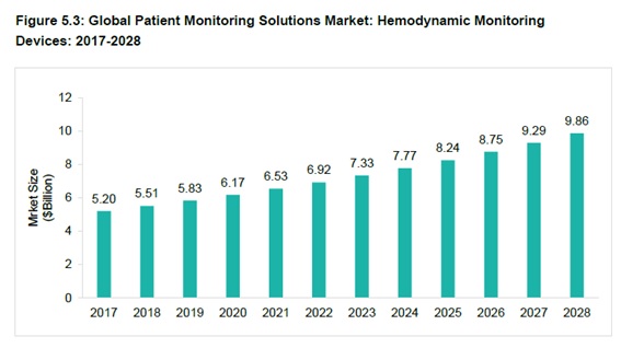 上の図は、2018年に55億1,000万ドルの価値があり、2028年には98億6000万ドルに達すると予想され、2019-2028年の予測期間中にCAGR 6.01%で成長する血行動態モニタリングデバイスを示しています。