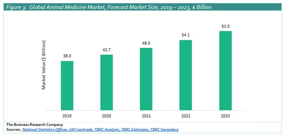 動物医薬の世界市場規模は、2015年から11.7%の複合年間成長率(CAGR)で成長し、2019年には約380億ドルに達しました。 今後、2023年までにはCAGR 12.5%で拡大し、約610億ドルに成長すると予測されています。