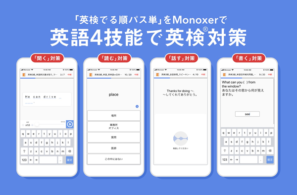 昨今の教育改革により、英語においてはリスニング、リーディング、スピーキング、ライティングの4技能の習得と活用が求められています。英語4技能を測定する検定試験の中でも、特に英検の取得および対策のニーズが高いことから、この度、旺文社よりライセンスを受け、「英検でる順パス単」をベースとした英検対策教材を、Monoxerの法人利用ユーザーに向けて提供開始しました。英検のすべての級(1級~5級)をラインナップしています。