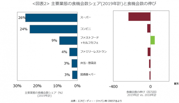 外食・中食市場情報サービス『CREST(R)*1』を提供するエヌピーディー・ジャパン株式会社(東京都港区、トーマス・リンチ代表)は、外食・中食市場2019年計(1-12月)の動向分析レポートを2020年3月5日に公表します。また、本分析を含む「外食・中食マーケットトレンドレポート2019年計編」を販売します。