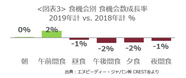食機会別の食機会数成長率(図表3)をみると、午前間食が2%増と好調で、朝食は0.3%増の微増でした。年の後半に、消費増税による節約志向の高まりで、専業主婦と14才以下の子どもがスーパーの中食を利用した朝食を減らし、内食へシフトしたことで、前半好調だった朝食が微増にとどまりました。会社員の朝食は成長を続けています。
