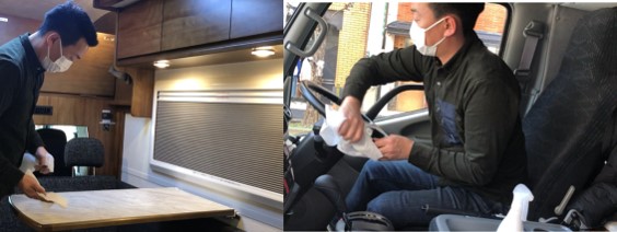 レンタルする車両については貸し出しごとにスタッフが隅々まで除菌対応を行っており、接客時についてもマスクをつけて対応しています。