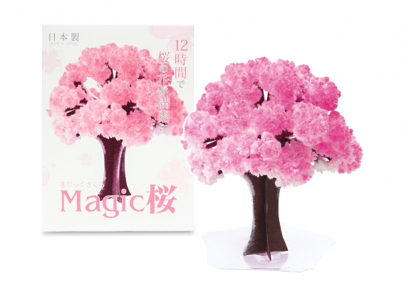 マジック桜とは、紙で出来た木に魔法の水をかけるとわずか12時間で咲く手のひらサイズの不思議な桜です。ミニサイズや、梅の花が咲く『マジック梅(プラム)』、ハートの花が咲く『マジックラブツリー』も販売しています。