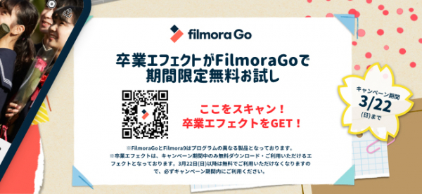 消費者向けソフトウェア開発・販売を展開する株式会社ワンダーシェアーソフトウェア(東京都千代田区、代表 吴太兵)は令和2 年3月6日(金)より期間限定で、FilmoraGoの新作卒業エフェクトを無料ダウンロードできるキャンペーンを実施いたします。