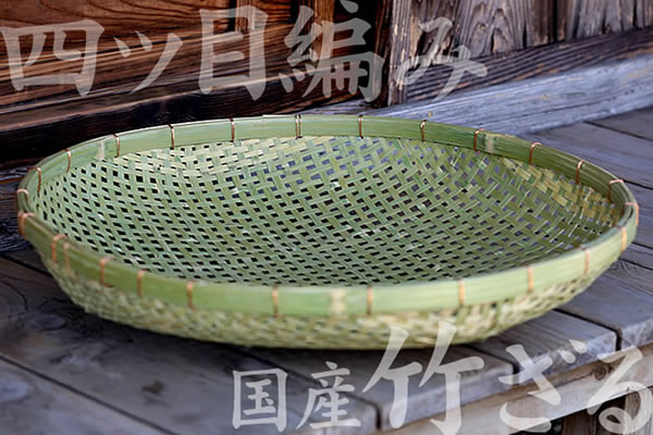 国産四ツ目竹ざる(60cm)は、幅の広い竹ヒゴを四ツ目編みした、土用干しにはなんとも便利な竹ざる。直径約60cmで梅干しなら約3.5kgが干せるサイズなので、梅干し以外にも干し野菜や干物など、様々な使い方ができそうです。