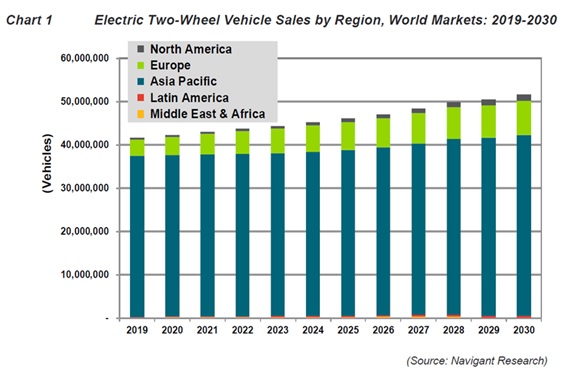 バッテリー設計のイノベーションがユーザーに付加価値を低下させ始めるポイントは、エネルギー要件が最も低い車両アプリケーション、例えば、自転車、スクーター、人力車、低速車両などの軽車両に最も近いポイントです。ここで、既存のバッテリーテクノロジーは、より大きなEVの場合よりも、ユーザーのエネルギーニーズを満たしています。したがって、技術革新は、標準化を通じて規模を拡大し、コストを削減することに焦点を移す可能性があります。たとえば、電子スクーターには小さなバッテリーがあるため、場合によってはユーザーが手動で交換することができます。フルサイズのEVのドライバーがバッテリーを手で交換することは現実的ではありません。手動のバッテリー交換により、小型車やバス用に展開された自動システムの開発と管理に関連する多大なコストを回避できます。これは励みになりますが、図1は、ライトEVとeスクーターの市場がアジア太平洋地域に集中する傾向があり、それらの地域の国々への投資機会を制限していることを示しています。