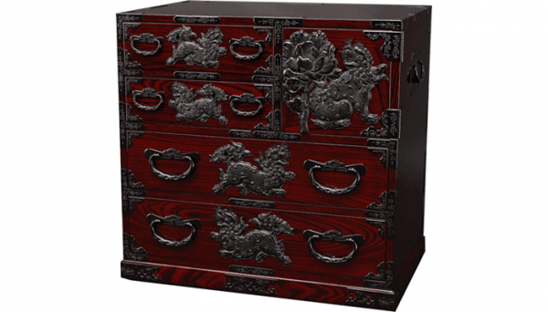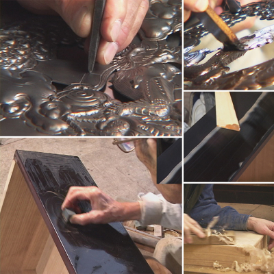 その中でも最大の特徴は、漆の輝きの上に、もうひとつ豪華な味わいと表情をつくる飾り金具です。金具は大型で、龍や唐獅子、牡丹や菊など、さまざまな文様が打ち出されます。箪笥の大きさにもよりますが、用意される金具の数は一棹で100~200個。鉄の板にまるで命を吹き込むように、文様を打ちだしていくのが金具師の仕事です。金具を取り付けた箪笥は、豪華で、実にいきいきとした表情を持ち始めの芸術の粋ともいえます。